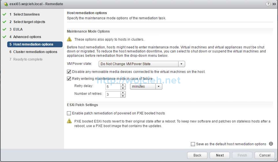 - In **Host remediation options **we can decide if we want to change VM Power state, disable any removable media devices connected to the virtual machines or how many times maintenance mode will run in case of a failure.